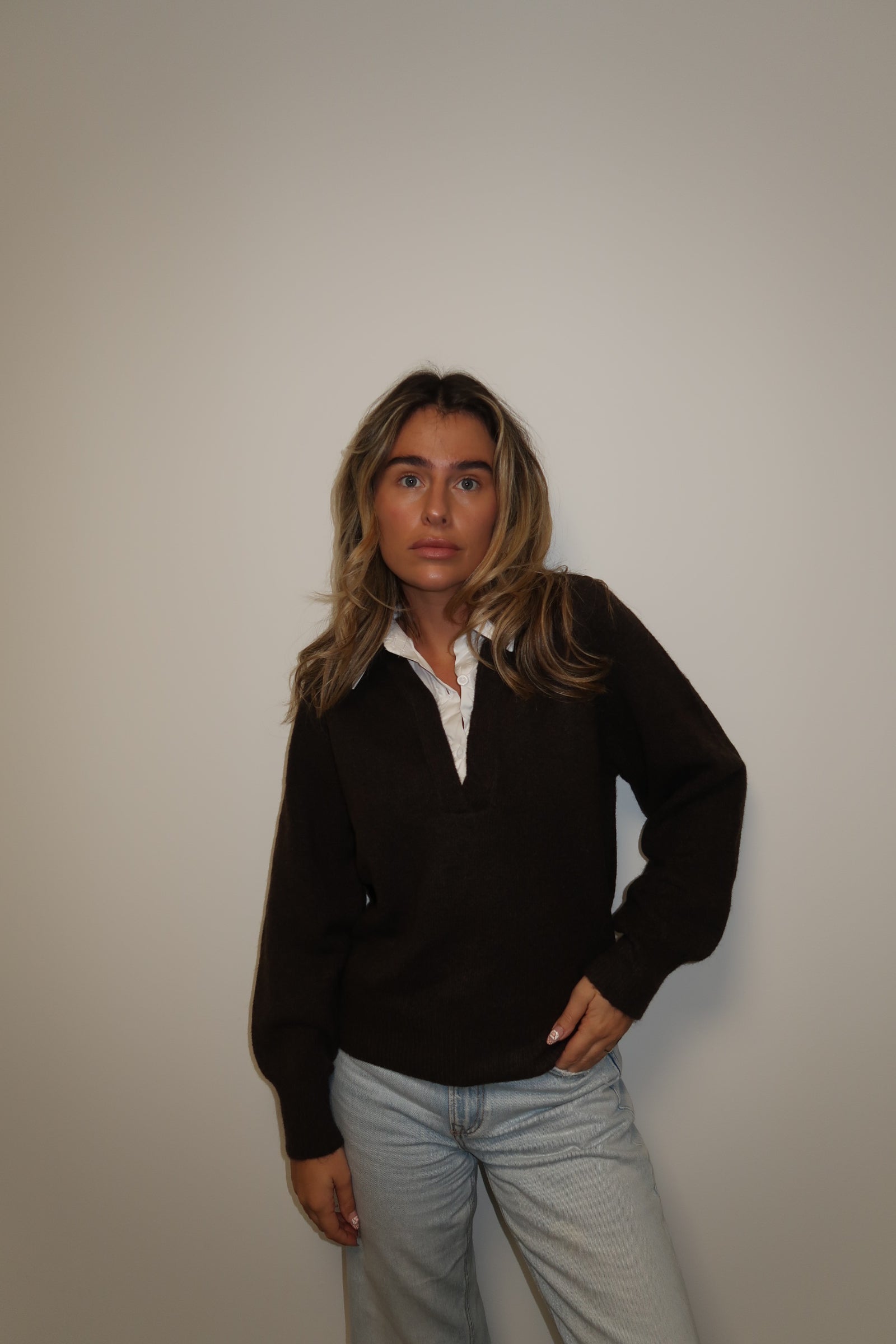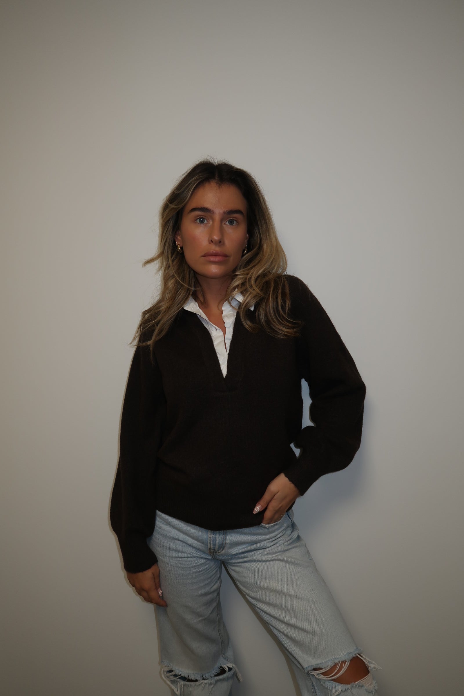 This brushed chocolate knit layered with a crisp white collar is where softness meets structure. Perfect for crisp winter days